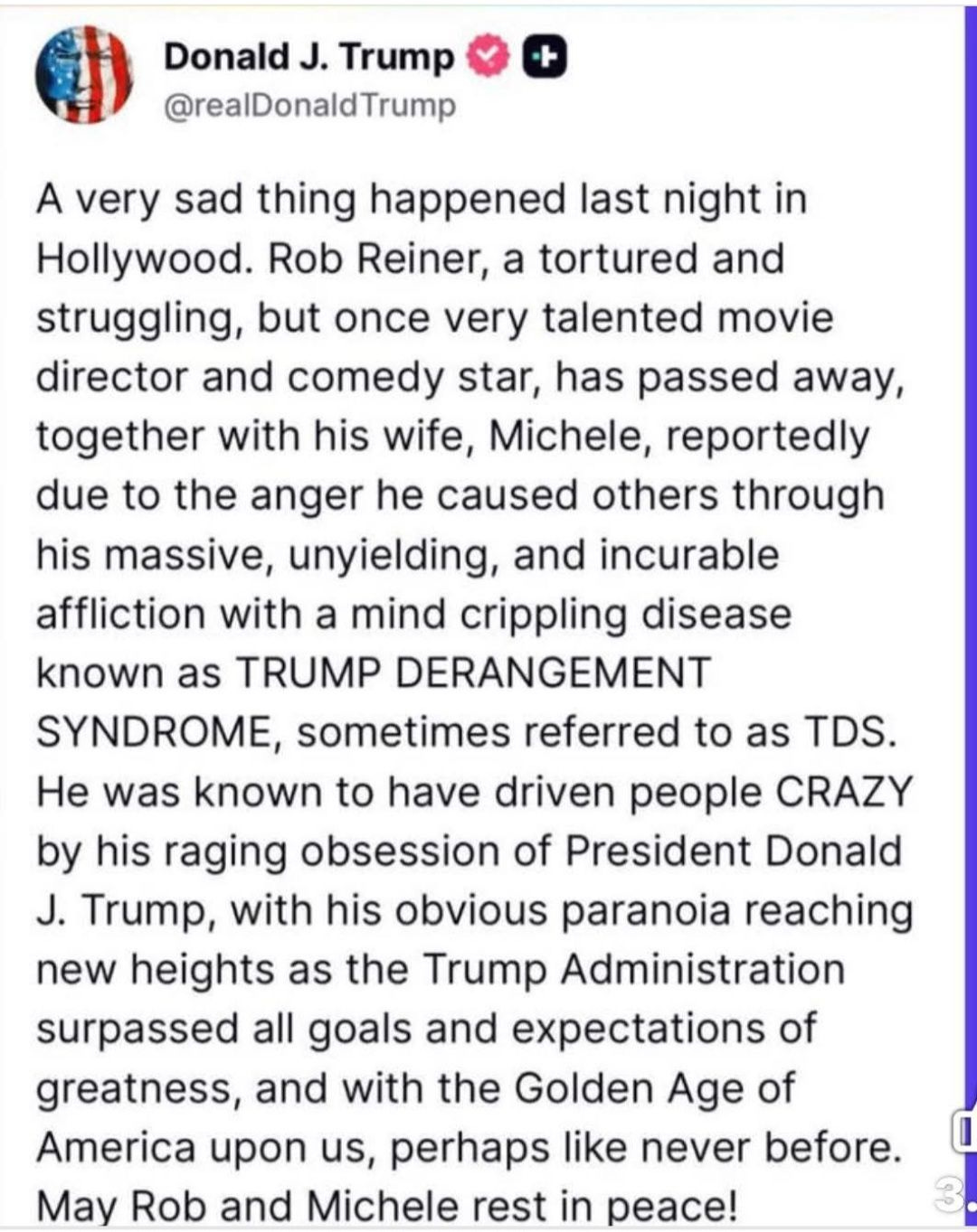 As you know by now, Donald Trump unleashed a garbage post about Rob Reiner hours after his death. He basically blamed the so-called Trump Derangement Syndrome for his death, insinuating that he would still be alive if he were a member of the MAGA movement.