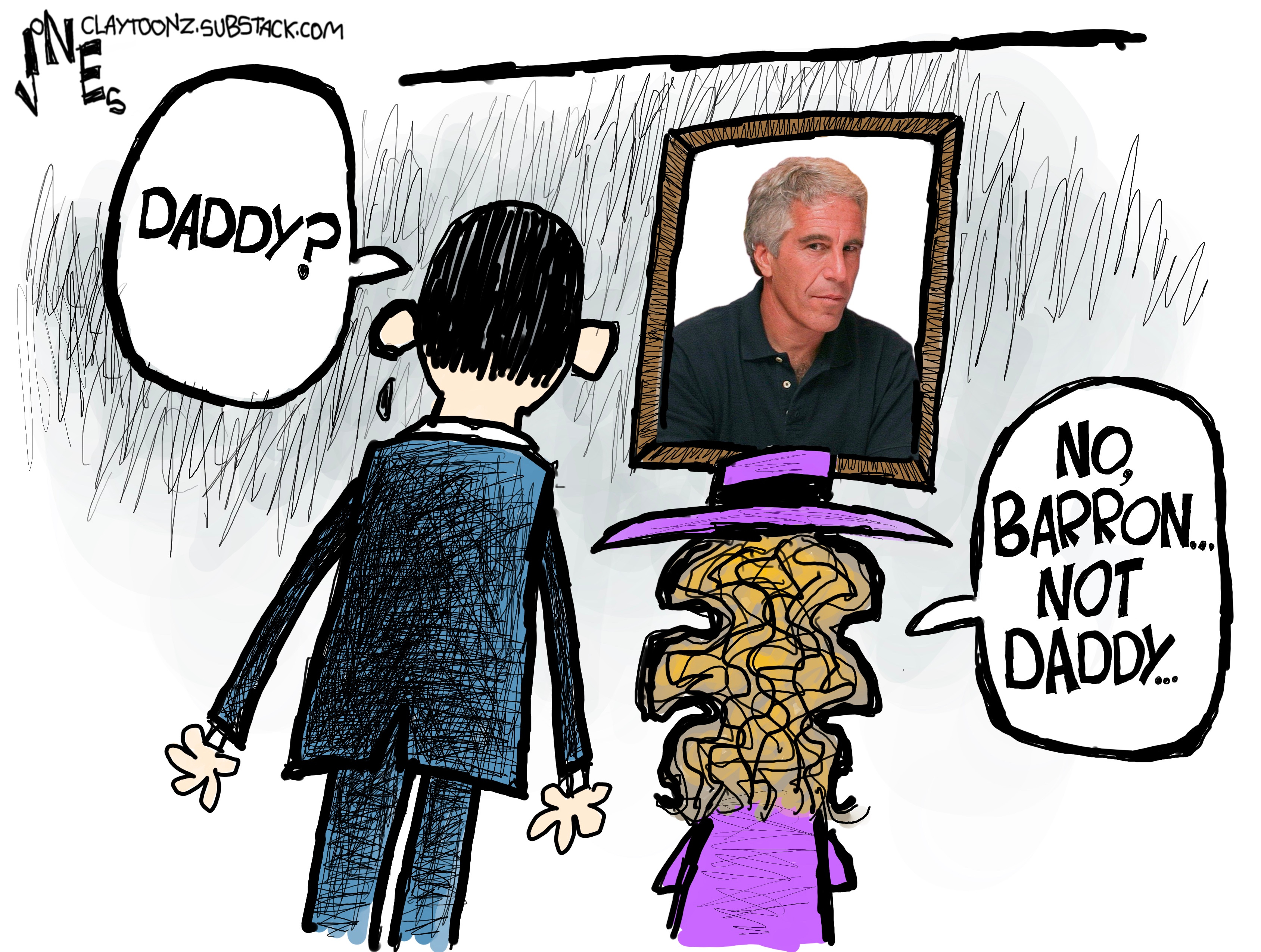 Very clever cartoon--its wording, for starters, but also for drawing Barron and Melania with their backs to us (very effective) and for placing Epstein's framed photo on the wall in prominent, full view. The expression on Epstein's face is appropriately cagey.
