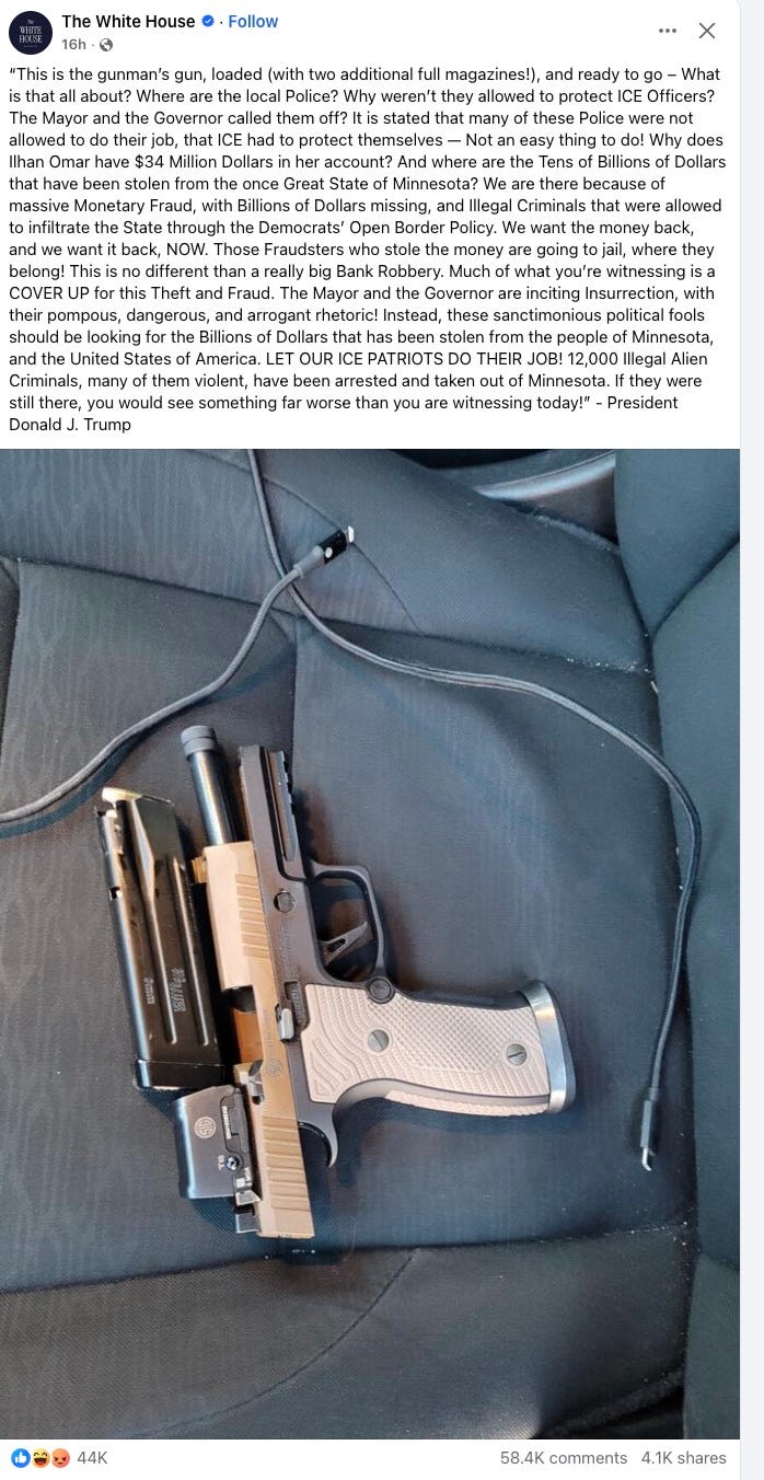 It is not a crime for Pretti to have a gun since he had a permit to conceal and carry. Donald Trump invited Kyle Rittenhouse to MAGA-Lardo. This has nothing to do with undocumented immigrants. This has nothing to do with fraud. This has nothing to do with Ilhan Omar having $34 million in our bank account. This has nothing to do with Democrats’ so-called “open border policies.” I have not witnessed the mayor of Minneapolis or the governor of Minnesota citing an insurrection or spouting off violent rhetoric. This is Donald Trump lying and deflecting again.