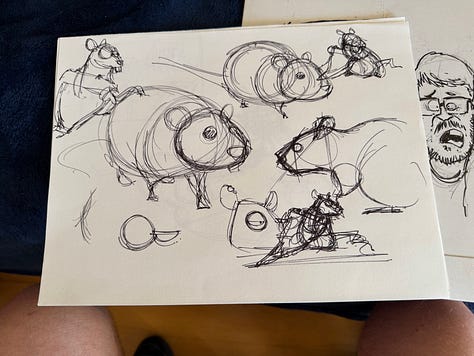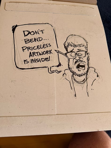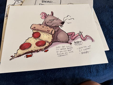 A few weeks ago, my colleagues were drawing their own versions of Pizza Rat to raise support for me after my stroke. Yesterday, I received a large envelope from Kevin Necessary containing the original of his pizza rat along with the practice drawings of our favorite rodent. Kevin was also cool enough to draw his own caricature on the envelope, thus forcing me to keep it forever. Thank you, Kevin. You rock!