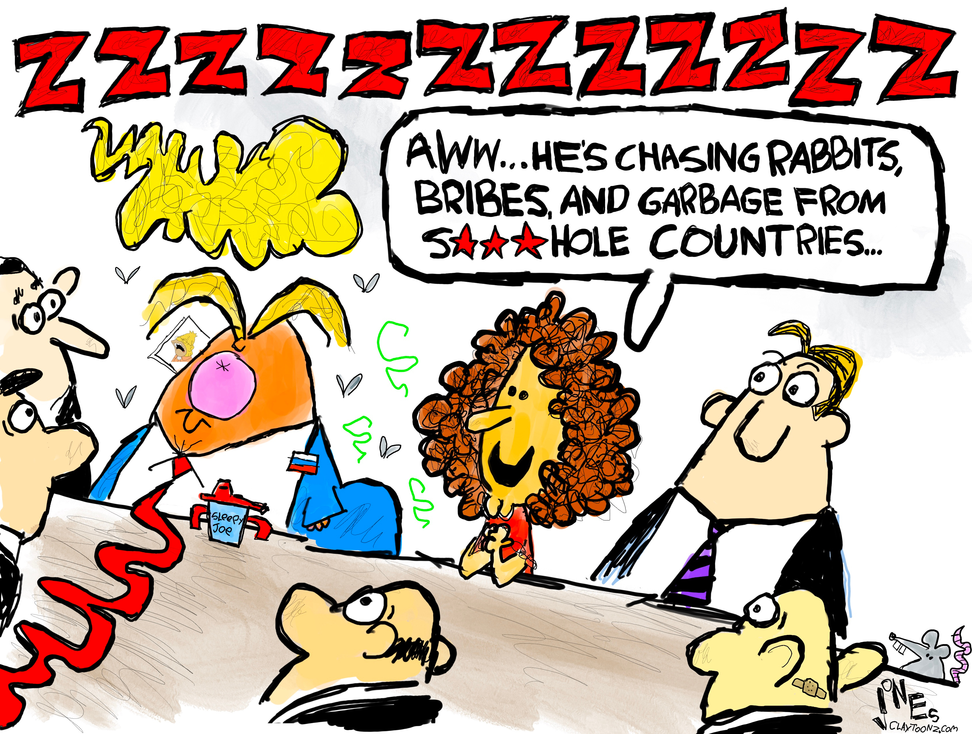 When asked later if Trump was falling asleep, White House spokesgoon Karoline Leavitt pointed at Trump's tirade against Somali refugees, as though Trump's racist rant proves his energy. The White House staff should make a note before Trump calls human beings “garbage,” and make sure he has a Red Bull beforehand.