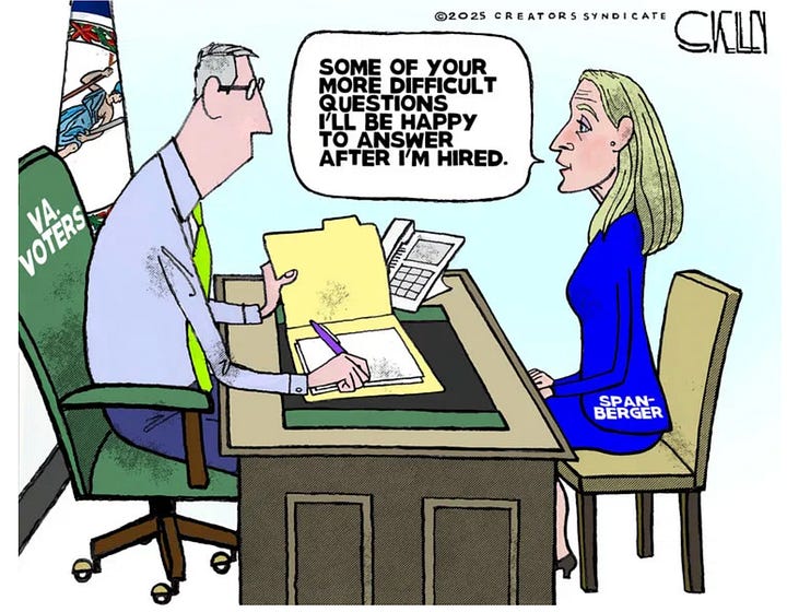 Steve Kelley and Dick Wright are both claiming that Abigail Spanberger refuses to answer questions, but the question they're referring to is about boys in girls’ locker rooms. This is something that's not happening. Here's a question you can’t answer: Why won't Donald Trump endorse her opponent, Winsome Earle-Sears? Why does Earle-Sears want to take away abortion rights from every woman in Virginia? Why does Earle-Sears support the firing of thousands of federal employees in Virginia? I care a little bit more about that than the hypothetical bullshit about boys in girls’ locker rooms.