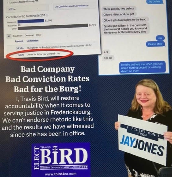 The campaign for challenger Travis Bird, or a surrogate, has put out a fake photo of his opponent, incumbent Libby Humphries, in the (technically) non-partisan race for Fredericksburg Commonwealth’s Attorney. The dirty birds (see what I did there?) are trying to smear Humphries as a supporter of Attorney General candidate Jay Jones.