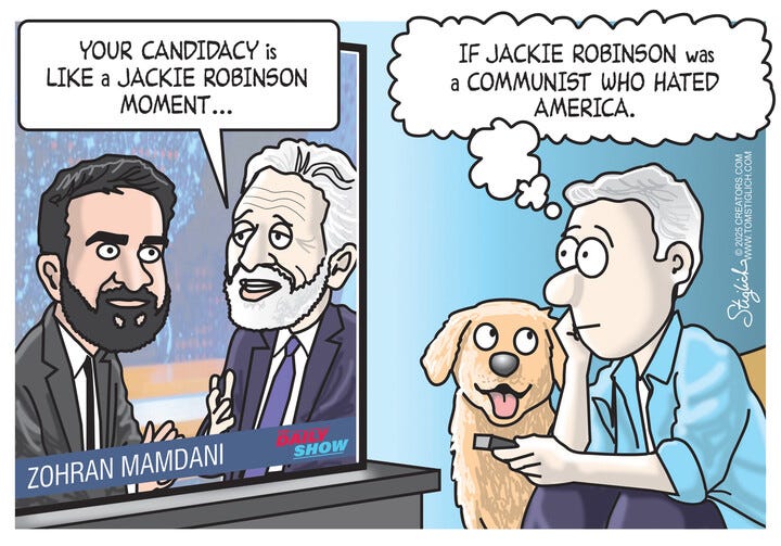 I wanted to take it easy on Tom because he bought me a $14 beer in Boston, and he is the only right-wing cartoonist who directly reached out to me after my stroke. I personally like Tom. But I can't ignore when he can't tell the difference between communism and democratic socialism, or when he engages in Islamophobia.