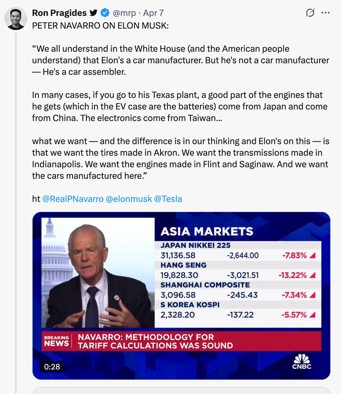 Navarro and Musk don’t agree on trade. So, after an insult from Elon, Navarro sent one back, saying Elon wasn't a car manufacturer, just an assembler of parts. Uh oh.