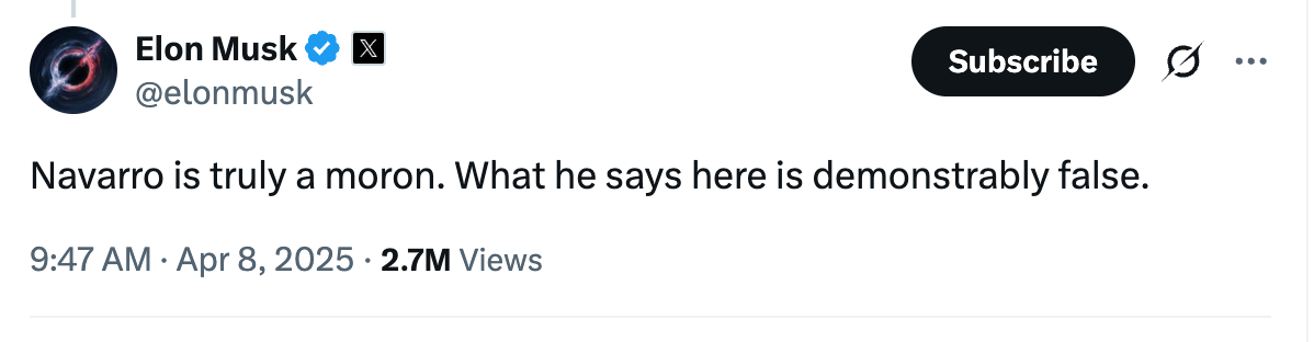 Elon responded to the video (which we don’t need to watch), saying, “Navarro is truly a moron.” He also said Navarro is “dumber than a sack of bricks.”