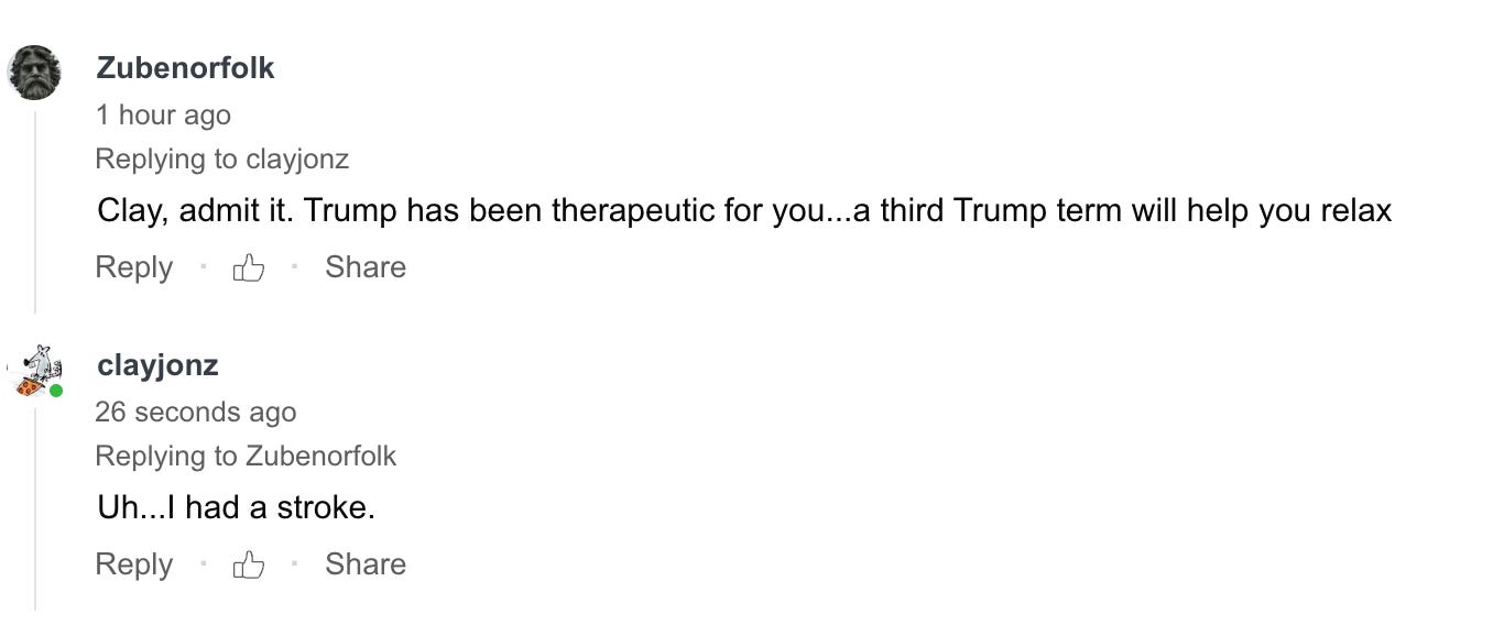 I don't give credit to Donald Trump for my stroke. He wishes. But I do believe my workload was a factor, which Donald Trump did contribute to. You know how people are always annoying cartoonists by telling us about how we are never going to run out of material. Yeah, that.