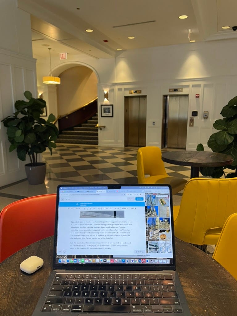 But, this Starbucks didn’t work out because it was way too crowded (so many tourists, who must have never been in a Starbucks before, were taking photos), so I used one of the other 97 Starbucks on Michigan Ave to draw today’s cartoon. I forgot to take a photo of that. But hey, this is where I’m writing this blog.