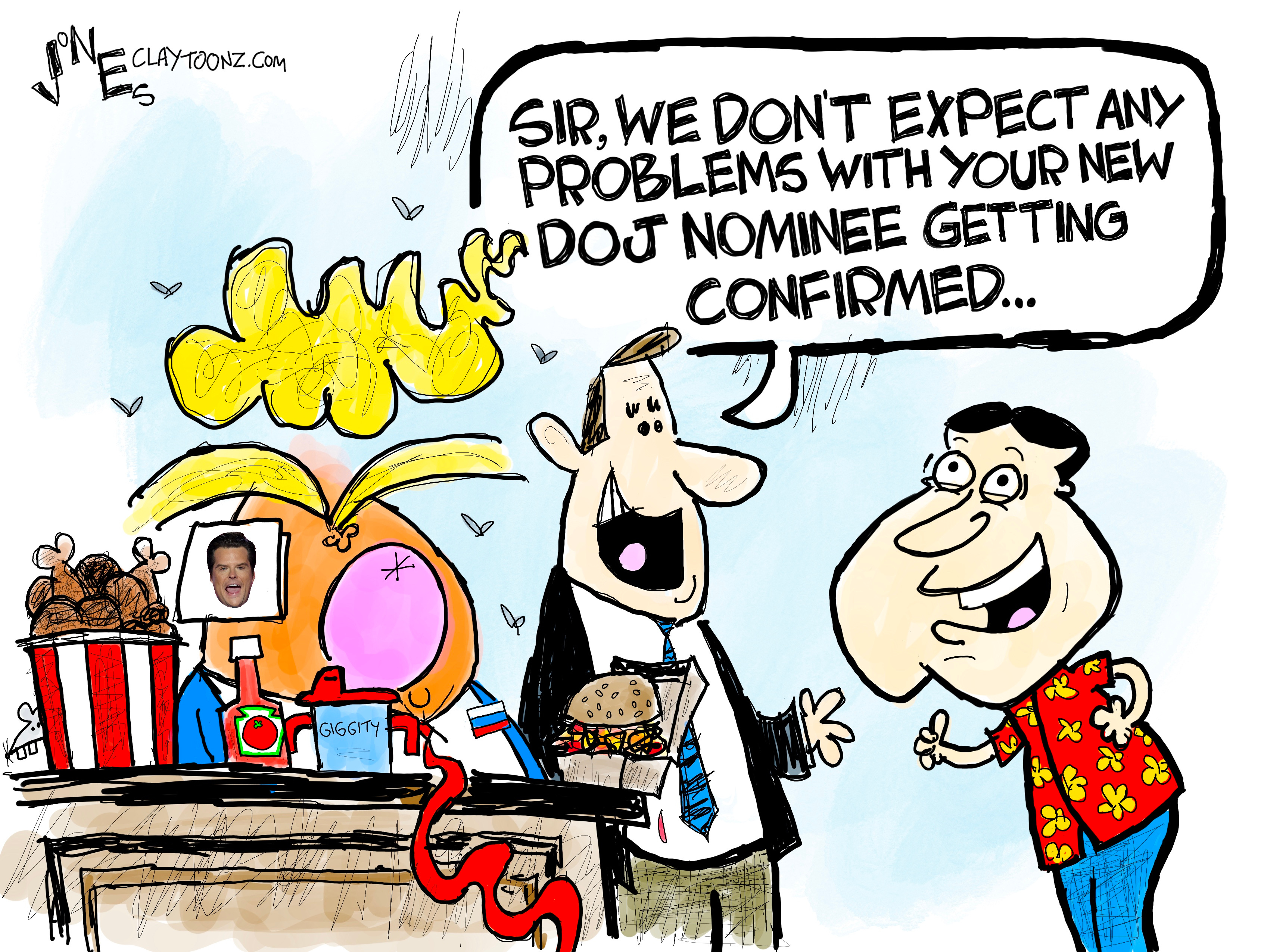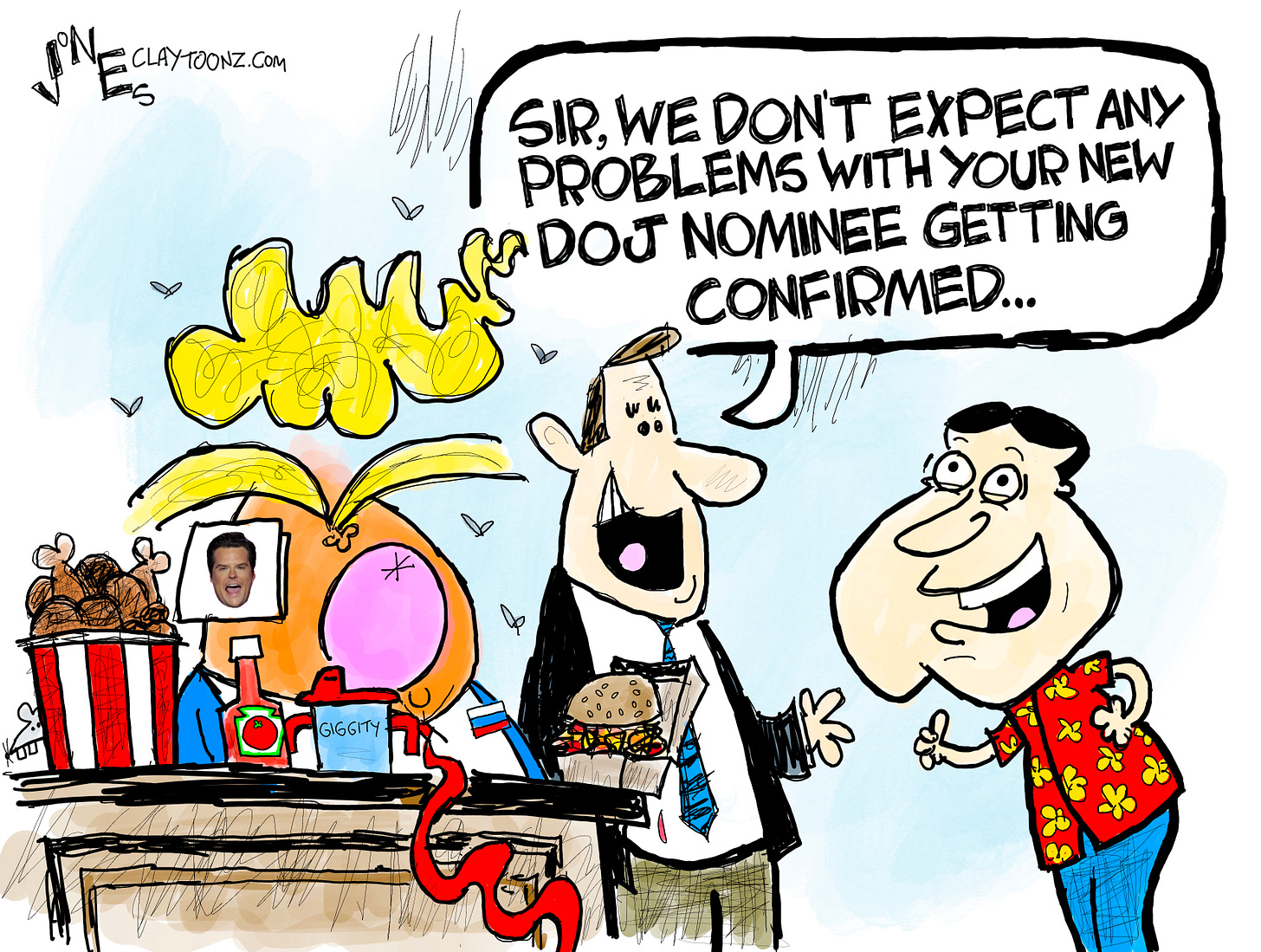 Minutes after I completed my previous cartoon on Matt Gaetz, he withdrew from being considered to be Trump’s Attorney General. While I felt the last cartoon was still relevant, I wanted to give my clients something for the new information in this new new normal same as the first new normal but not to be confused with the old normal.
