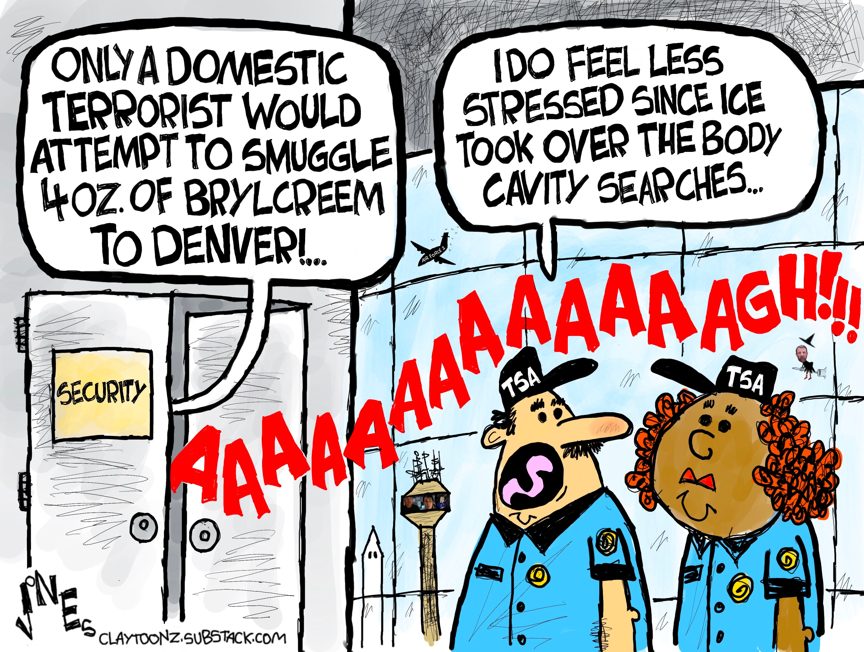 Creative note: A lot of my colleagues had the same idea for this issue, and they reworked it into their own design. Most of those cartoons are about ICE busting people for what they were trying to bring through TSA, like a tube of oversized toothpaste. One cartoon I read made a joke about ICE beating up a guy for not taking his shoes off, except shoes don't have to be taken off anymore at the airport. But I'm going to cut him some slack for that because I used a little creative license in my cartoon as well, because TSA does not actually do body cavity searches.