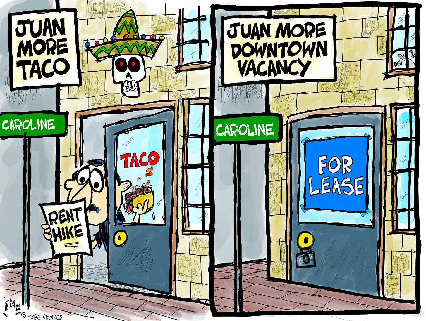 This cartoon was drawn for the FXBG Advance, which wrote the text accompanying my cartoon on its site, saying, “The cost of doing business in downtown Fredericksburg is rising — sharply. The question for many business owners may well be, how much higher can commercial rental space go before downtown’s commercial hub becomes not a street to stroll and admire all the interesting shops, but a street stroll and ask, “Just how many vacancies are there?” Three years ago, the cost for renting restaurant space rarely topped $40 - $45 per square foot. Today, it goes as high as $70. And retail space that is leasing now for $15–$22 per square foot was typically leasing in the $12–$18 per square foot range three years ago. All this is happening at a time of economic uncertainty not seen since the Great Recession. The impact? “We are seeing people being more conservative with their money,” Chris Allen, executive director of Fredericksburg Main Street, told the Advance. “And we’re seeing less foot traffic, especially during the week.” Our political cartoonist, Clay Jones, has been watching, and as ever, capturing the problem in his distinctive style.”