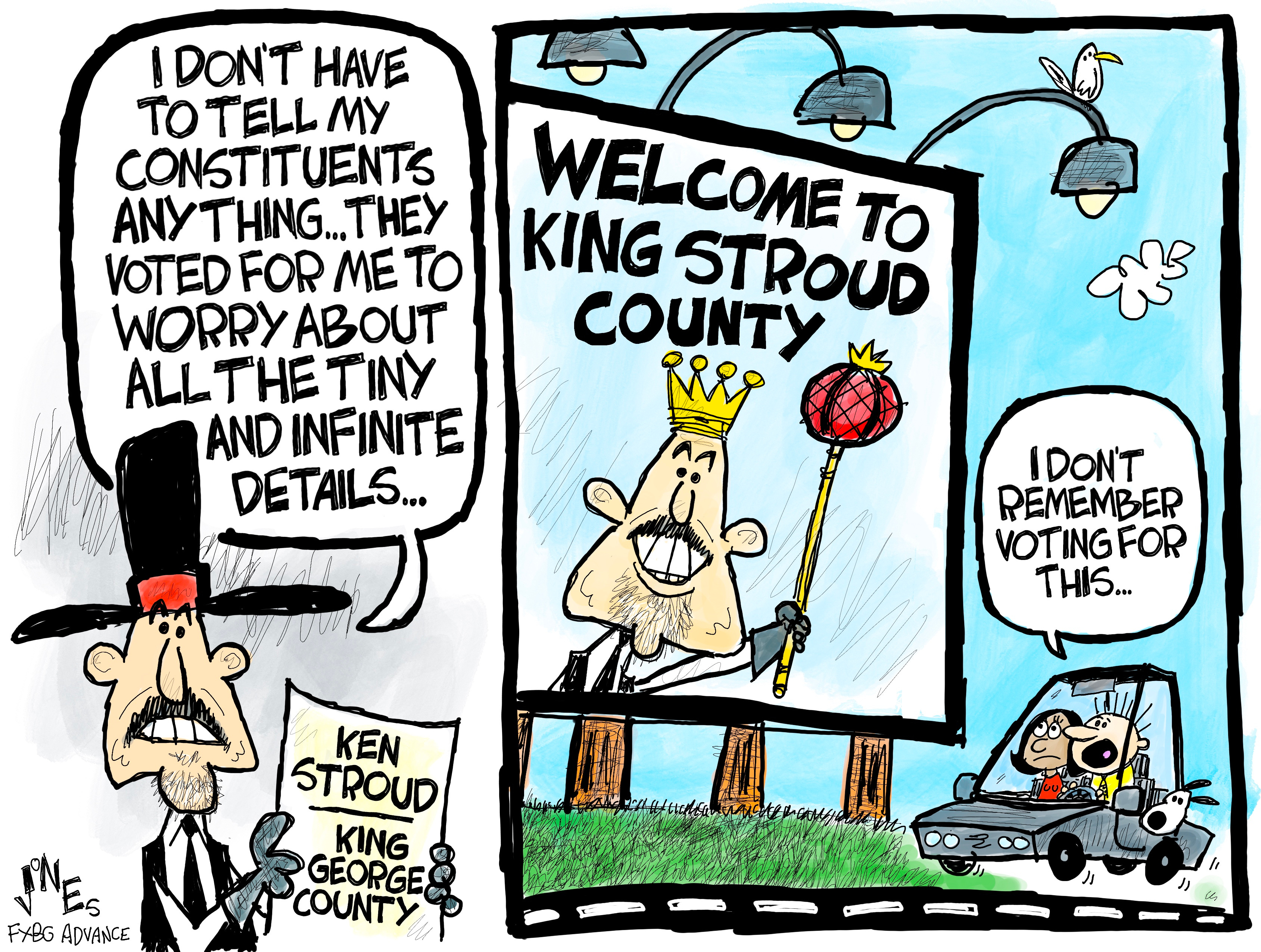 This cartoon was drawn for the FXBG Advance. County Supervisors in King George County (VA) aren’t informing voters of what they’re up to. They argue that King George Count voters have given them full authority to do whatever they want in secret since they won their elections.