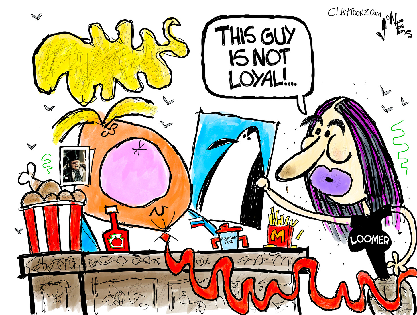 Most penguins are loyal to their mates during the time that they are copulating and taking care of their fertilized egg. I don't think any penguin would want to be loyal to the orange turd because he might consider them an alternative source for protein and fat, especially with bird flu, KFC wanting to move out of Kentucky and Mitch no longer being loyal to the orange turd, who has never been loyal to his own spouses, vp, other "mates", employees, sub-contractors, fellow citizens or the Constitution. Thanks again Clay for venting so beautifully the vitriol I feel about the turd and his turdlettes.