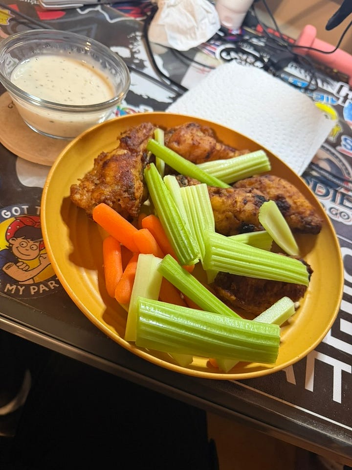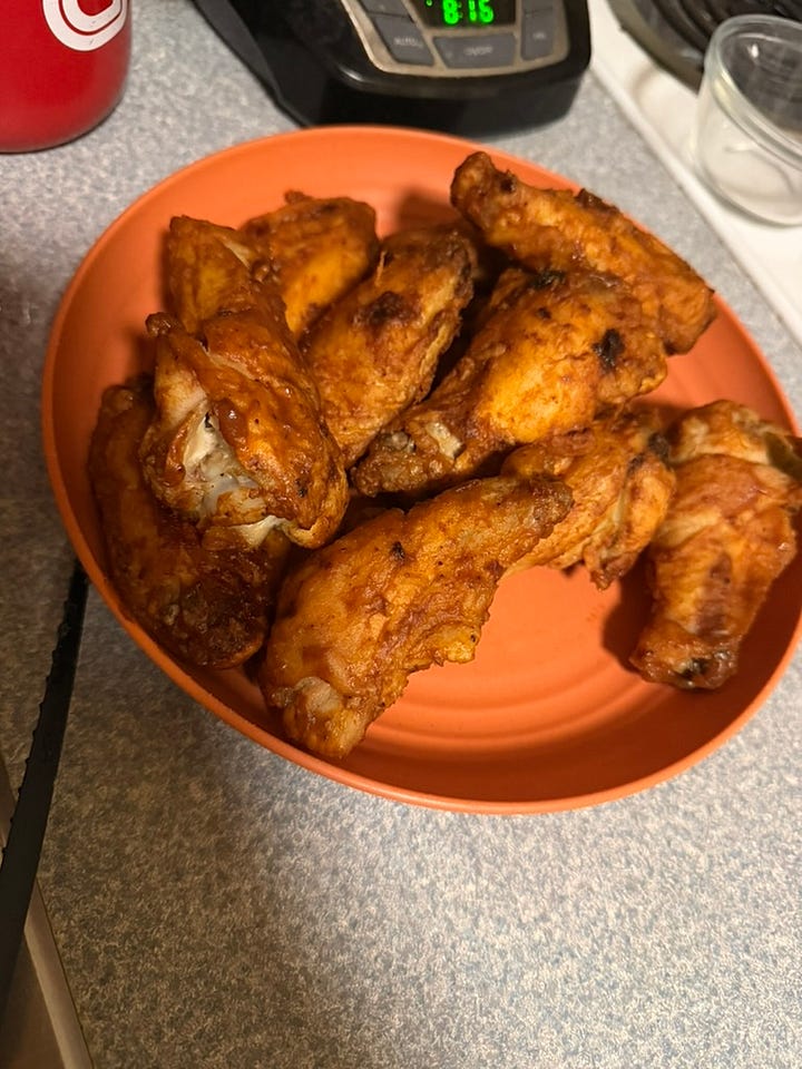 Eats: Last night, I cooked up some wings I've had in my freezer since last summer. There are rules to eating wings if you have diabetes, such as that they not be fried, have skin, or sugary breading. Another rule is that they are to be eaten in moderation, and with celery and carrots to balance things out.