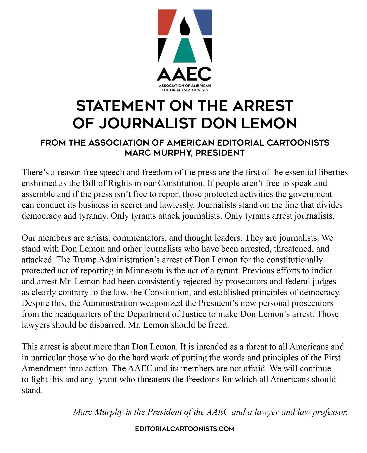 I am a member of the Association of American Editorial Cartoonists, and I also sit on its board of directors. Today, our president, Marc Murphy, wrote a statement for the organization in defense of journalist Don Lemon, who was arrested by the Trump regime for doing his job.