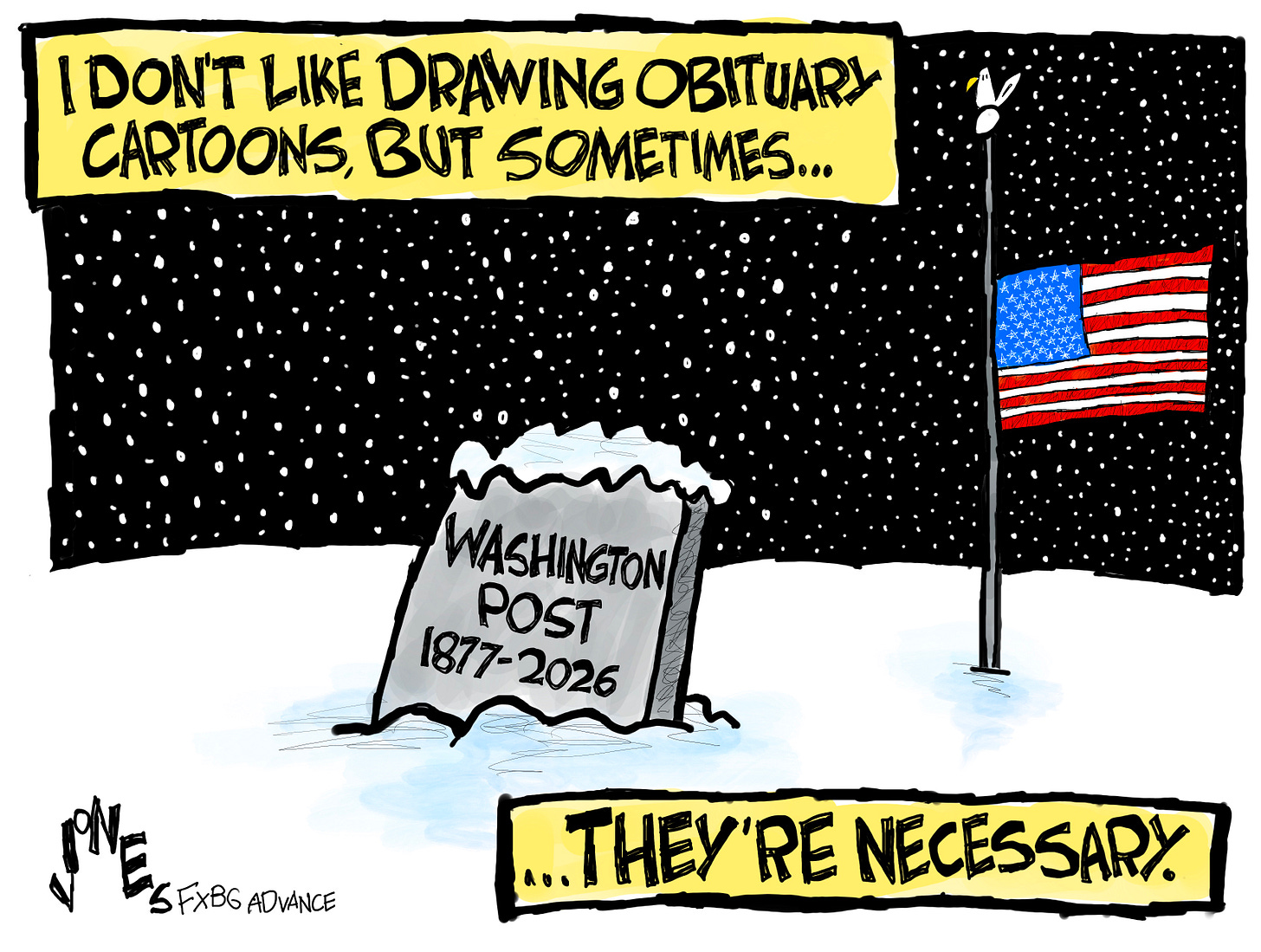 For a long time I read the NY Times and the Washington Post every day. Online, of course. After Ann Telnaes quit I dropped my WAPO sub and signed up with her. And with you. And a bunch more. I'm not sure what the future of journalism is, but I'm sticking with people who live in the fact-based universe. Keep on keeping on, dude!