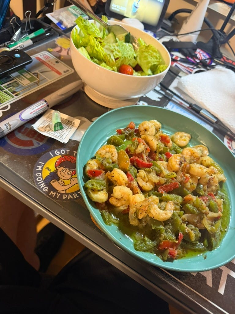 Some people have softly complained that I haven't been giving updates on my recovery. That's because there haven't been a lot of developments with it lately. I still need to start outpatient rehab, which I may want to do for only a short while, and reschedule a doctor’s appointment that was canceled because of the insurance flub back in January. My new insurance has kicked in now, but I'm waiting for all the snow to melt before I move about town to doctors’ offices and stuff. But for the time being, enjoy this pic of Friday night's dinner. It's shrimp, peppers, and onions with a salad on the side. I liked it.