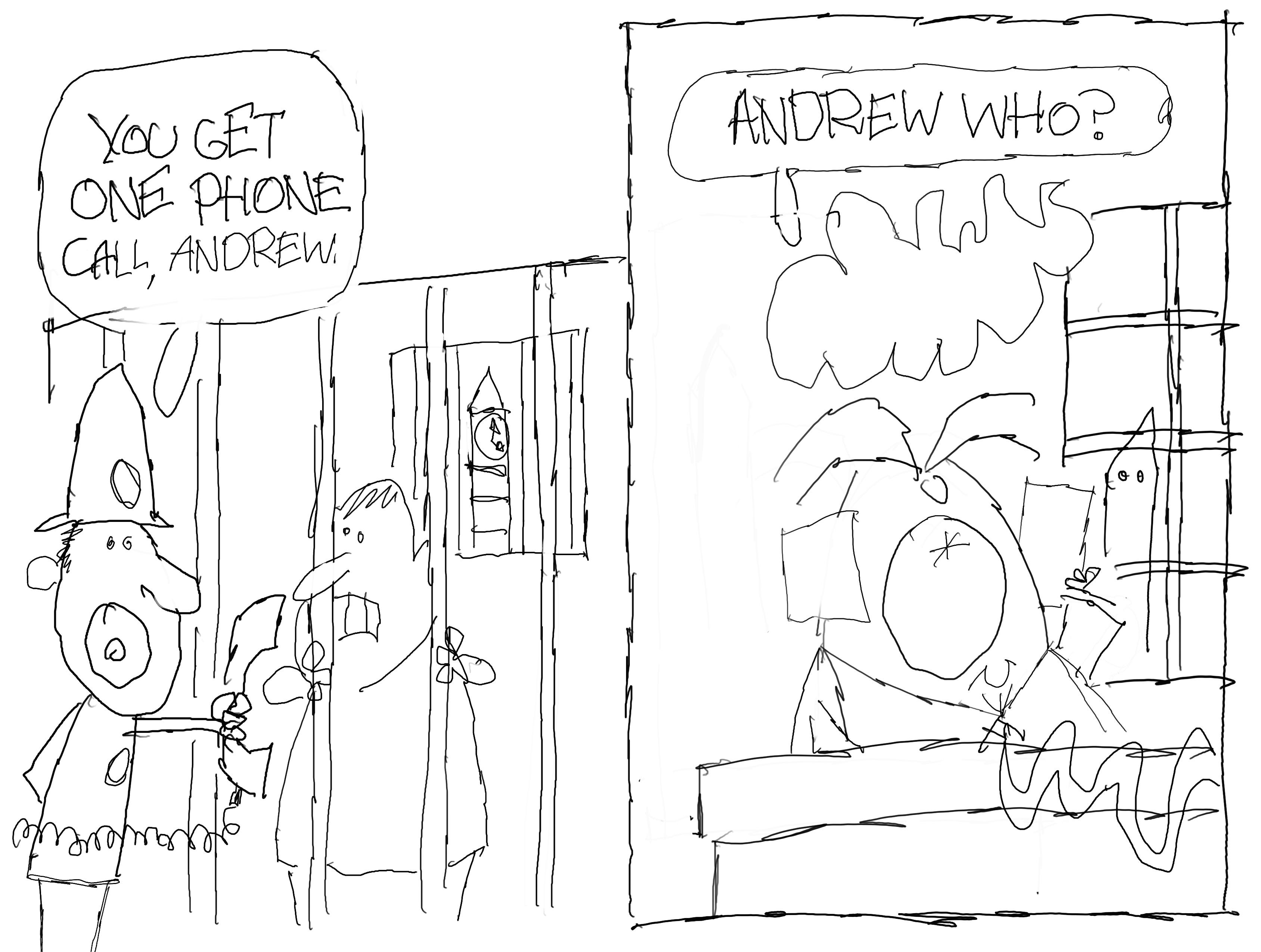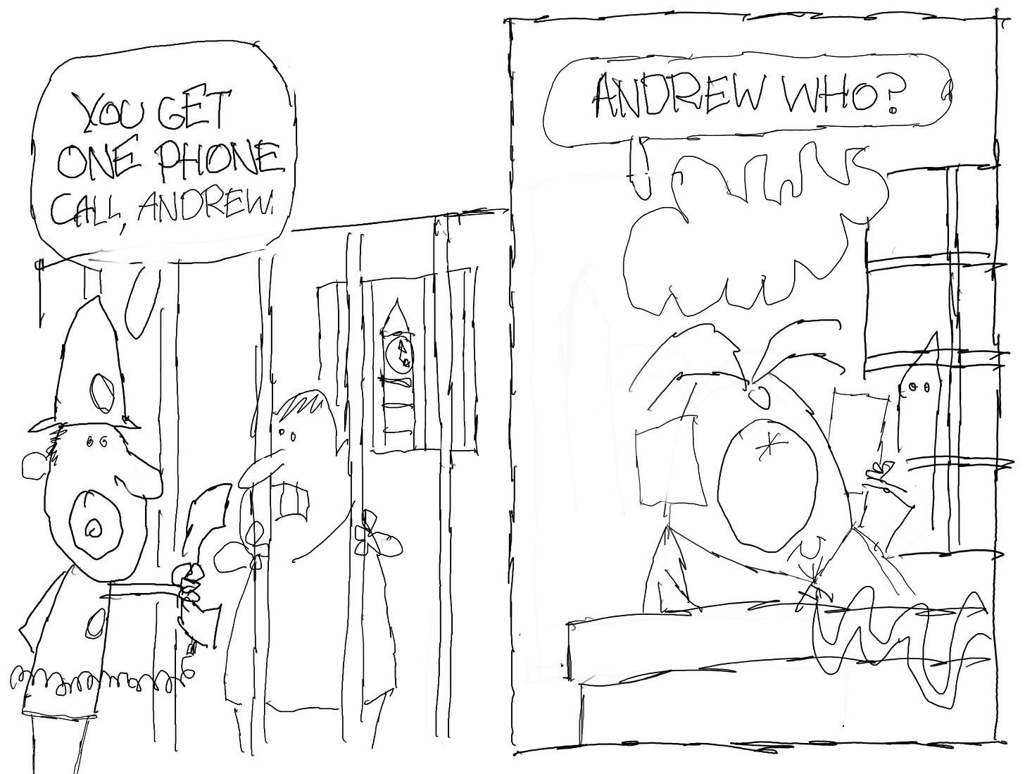 Give credit to Laura, who said right after proofreading this cartoon, “You can't spell ‘Andrew’ without ‘ew.’”