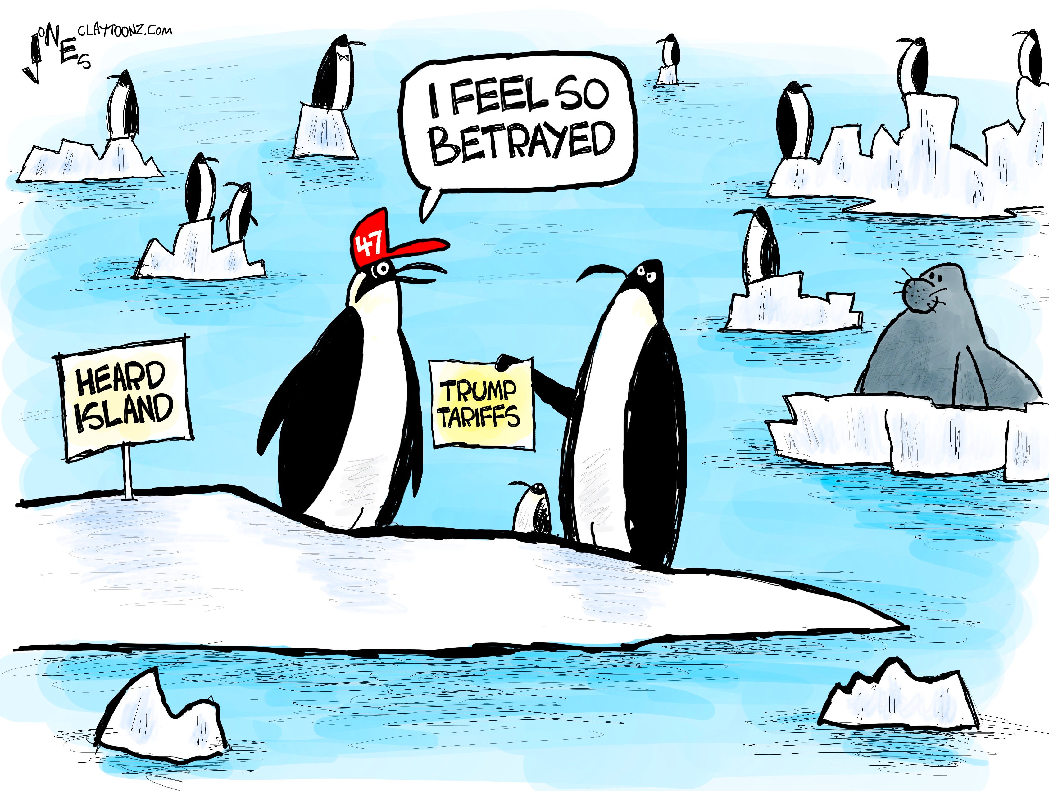 The tariffs on two of the most remote islands in the world where no products are exported from, or where humans don’t even visit, proves that the Trump administration hasn’t fully studied tariffs. If they’re placing tariffs on penguins, then how much have they studied the tariffs they’re placing on the French or British? How high are the tariffs on Thighland and Yo-Semite? Shit, don’t steal that for a cartoon, my political-cartooning colleagues!