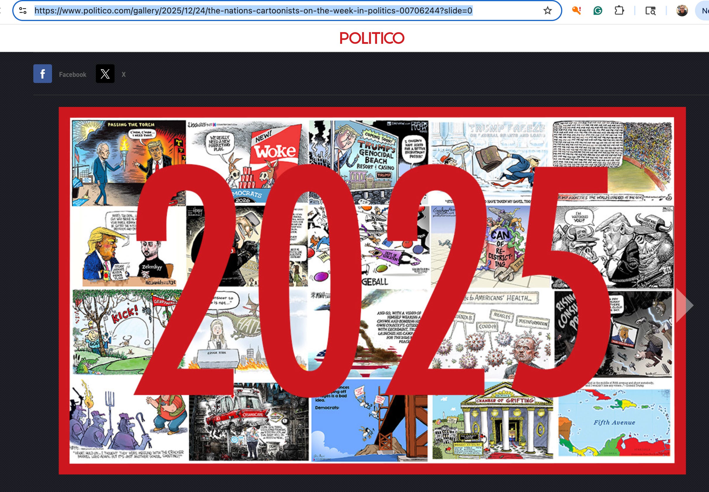 Politico: I made Politico’s end-of-year round-up, which I think is a little impressive since they only used my work four times in 2025, which is less than half the number of cartoons they used of mine in 2024. Those two racist nutjob hacks from Townhall make it nearly every week. Michael Ramirez, who doesn't know how to write a political cartoon, has two in the publication nearly every week.