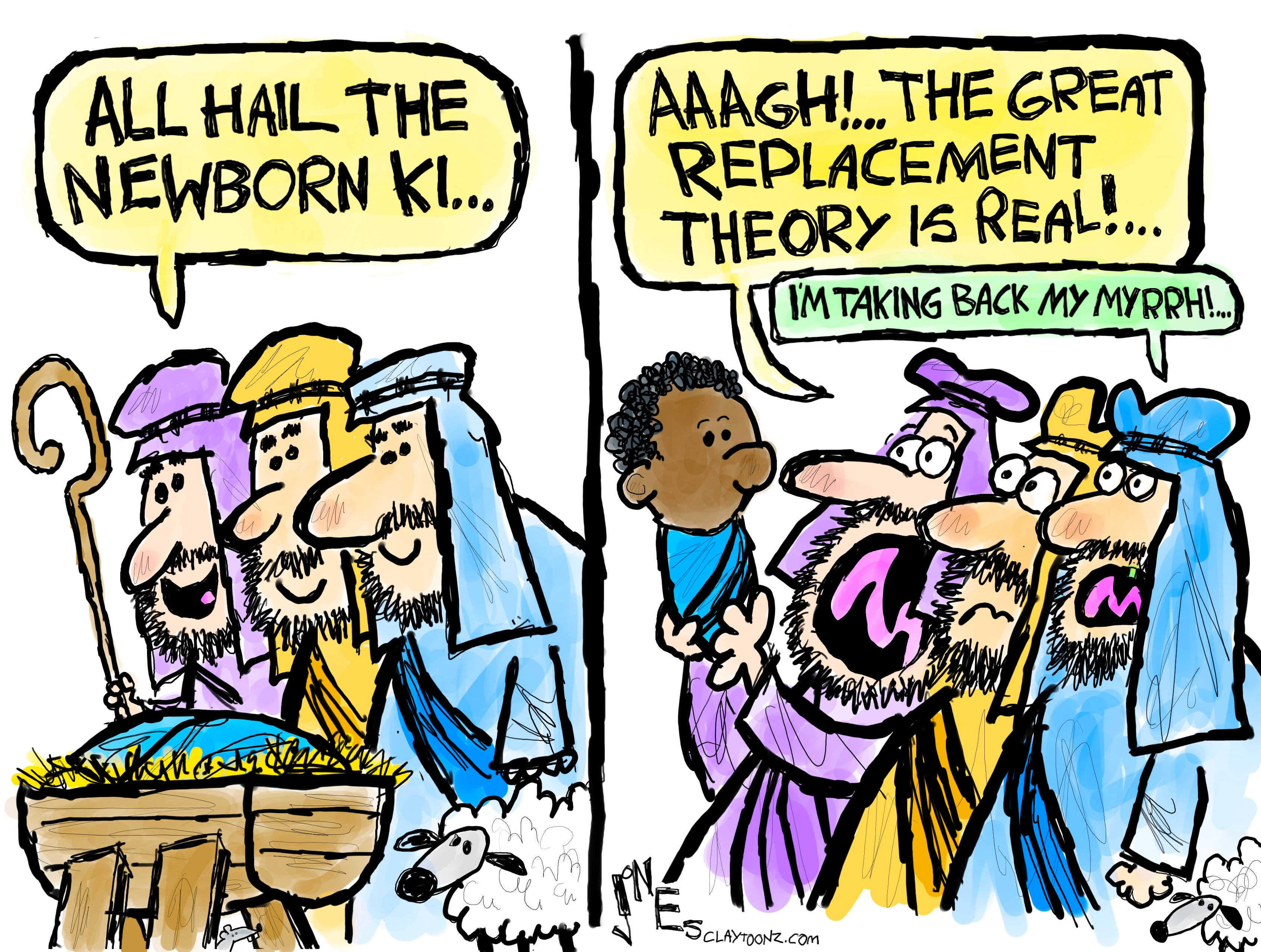 The Great Replacement Theory is a conspiracy theory pushed by white nationalists and Fox News (I know. redundant) that White people are being replaced by non-white people. This is one reason Republicans are so opposed to immigration, and not just illegal immigration, but legal. You've heard Donald Trump complaining about people from so-called shithole countries coming here and how he wants more people from places like Norway and Denmark.