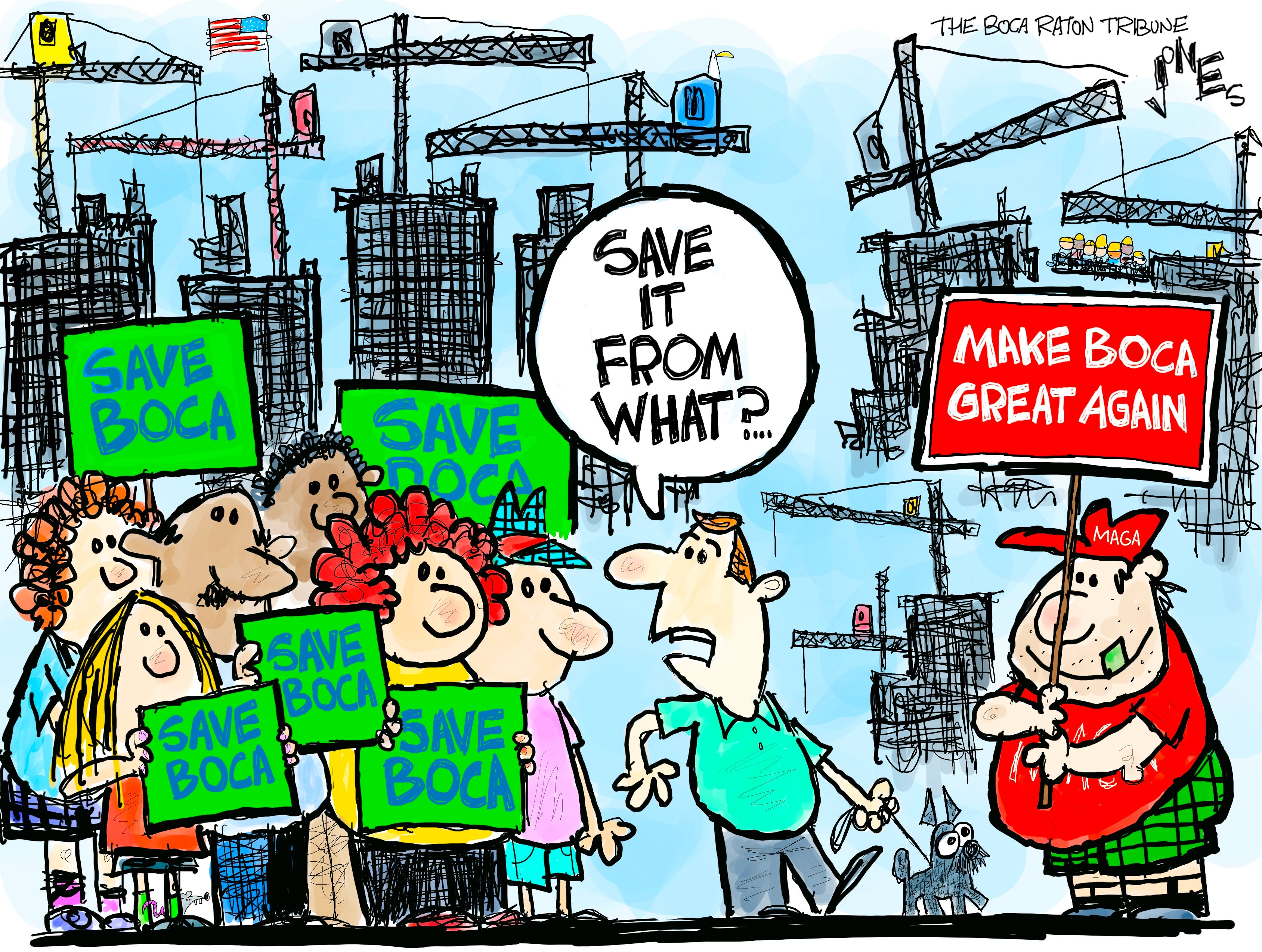 This cartoon was drawn for The Boca Raton Tribune. A group named Save Boca is trying to save the city from overdevelopment…and MAGA “leadership.”