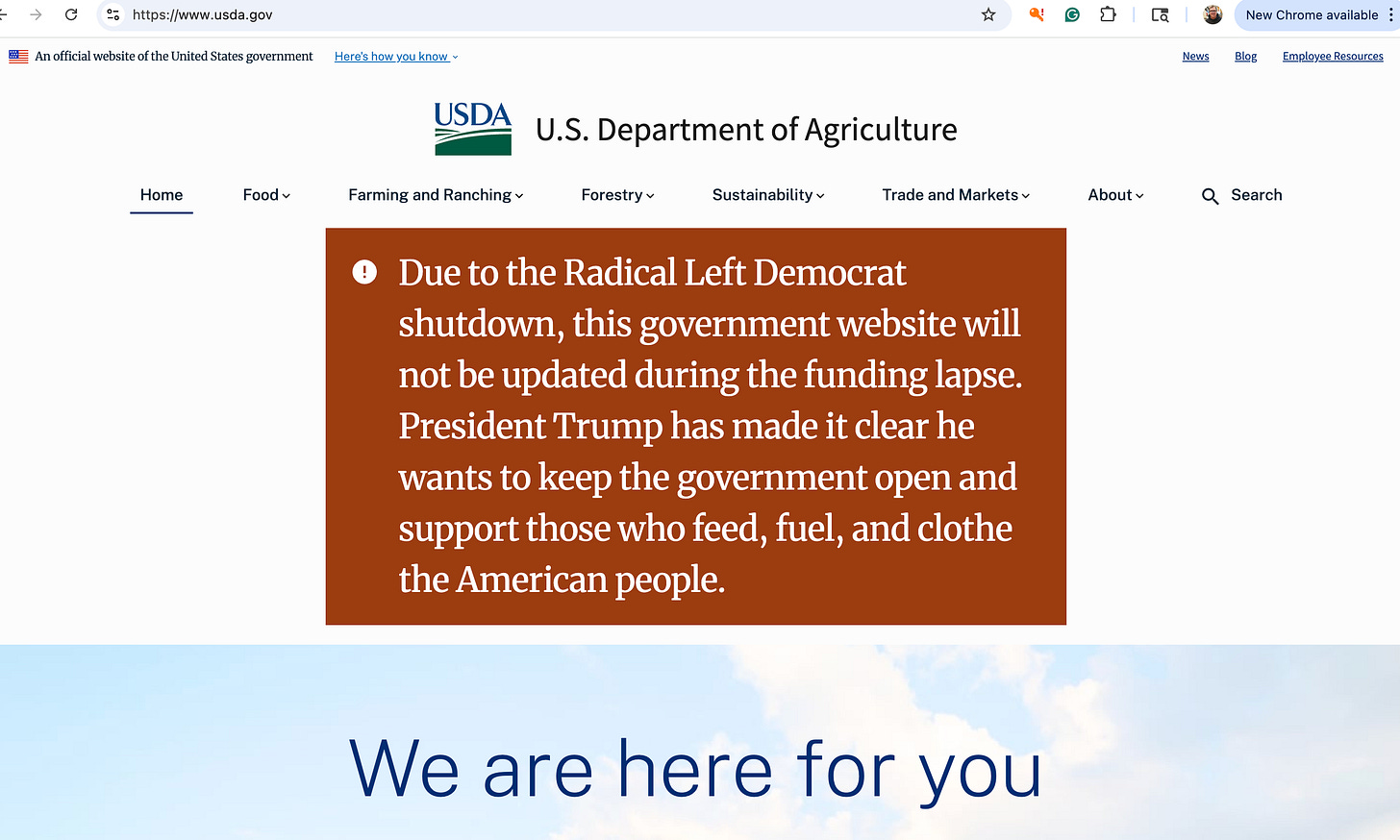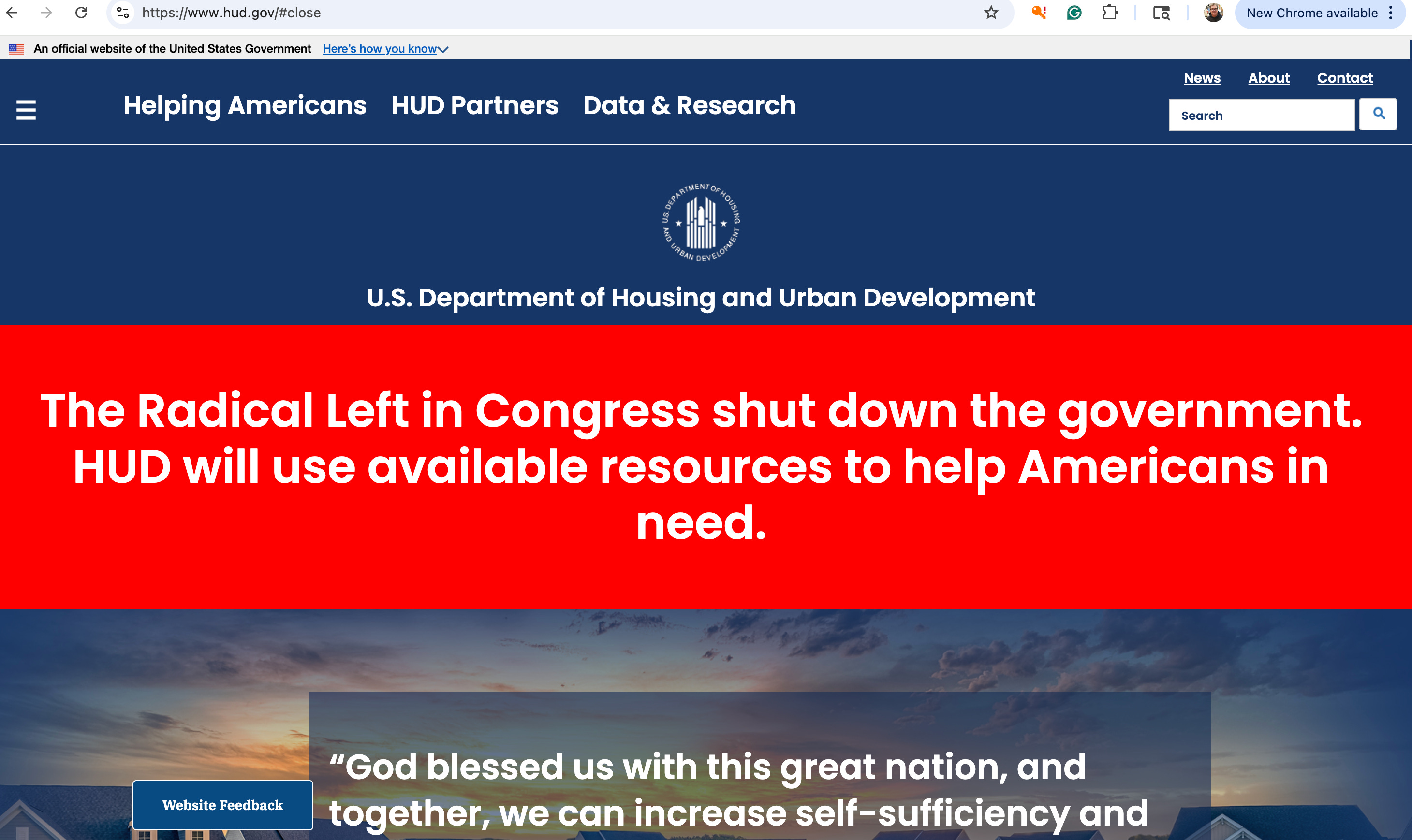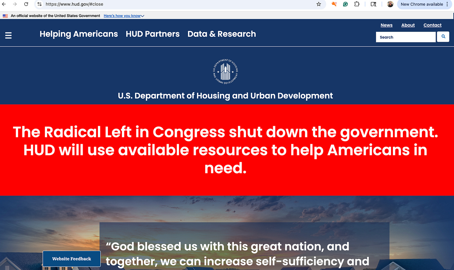 These are the websites for Housing and Urban Development and the Agriculture Department, both blaming Democrats.