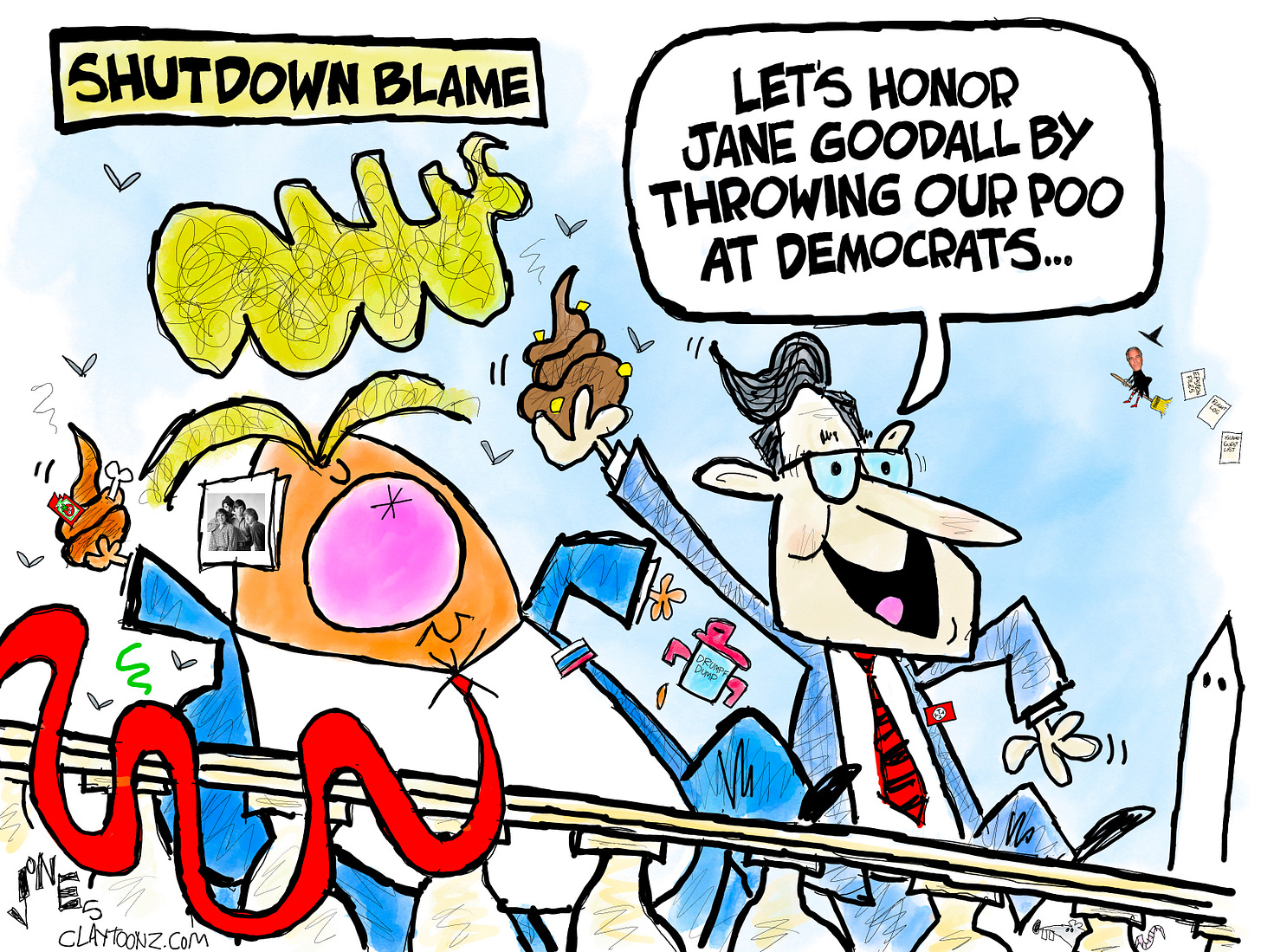 I think it’s clear it’s the Republicans’ fault, and they must know it too, since they’re knowingly lying about it. Speaker Mike Johnson is flinging poo by claiming Democrats shut down the government to give health care to “illegal” immigrants. Republicans are fucking liars.