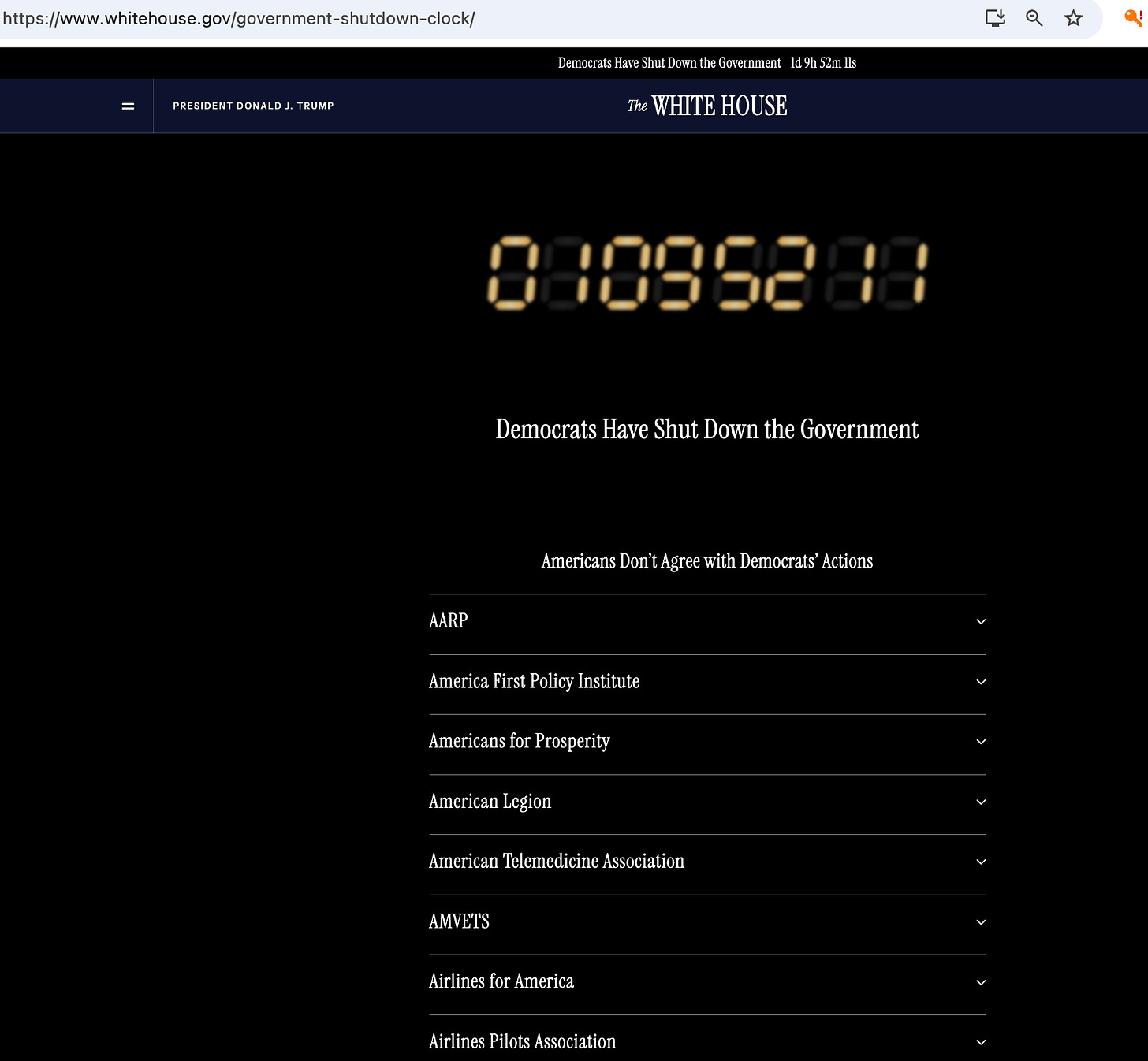 The current shutdown is over disagreements about federal aid, health insurance subsidies, and other evil cuts to the budget by Republicans. Two days into this shutdown, and over 900,000 federal employees have been furloughed, while another 700,000 are working without pay. Trump is promising firings and making permanent cuts to Democrats’ “favorite projects” if they don’t cave. As we learned from Trump’s second shutdown, he can’t negotiate.