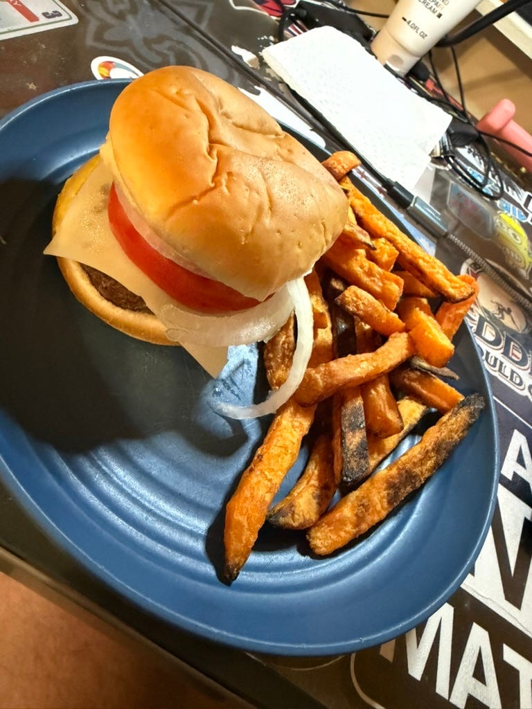 I purchased a pack of four patties, and I cooked two of them, expecting them to come out thin. I was wrong. They were pretty thick, so I only had one and saved the other for the next night. I piled on tomatoes and onions, but forgot the lettuce. Oops. I added a thin slice of Swiss cheese. As you can see, my side was sweet potato fries. They were frozen cause I don't have time to carve up sweet potatoes.