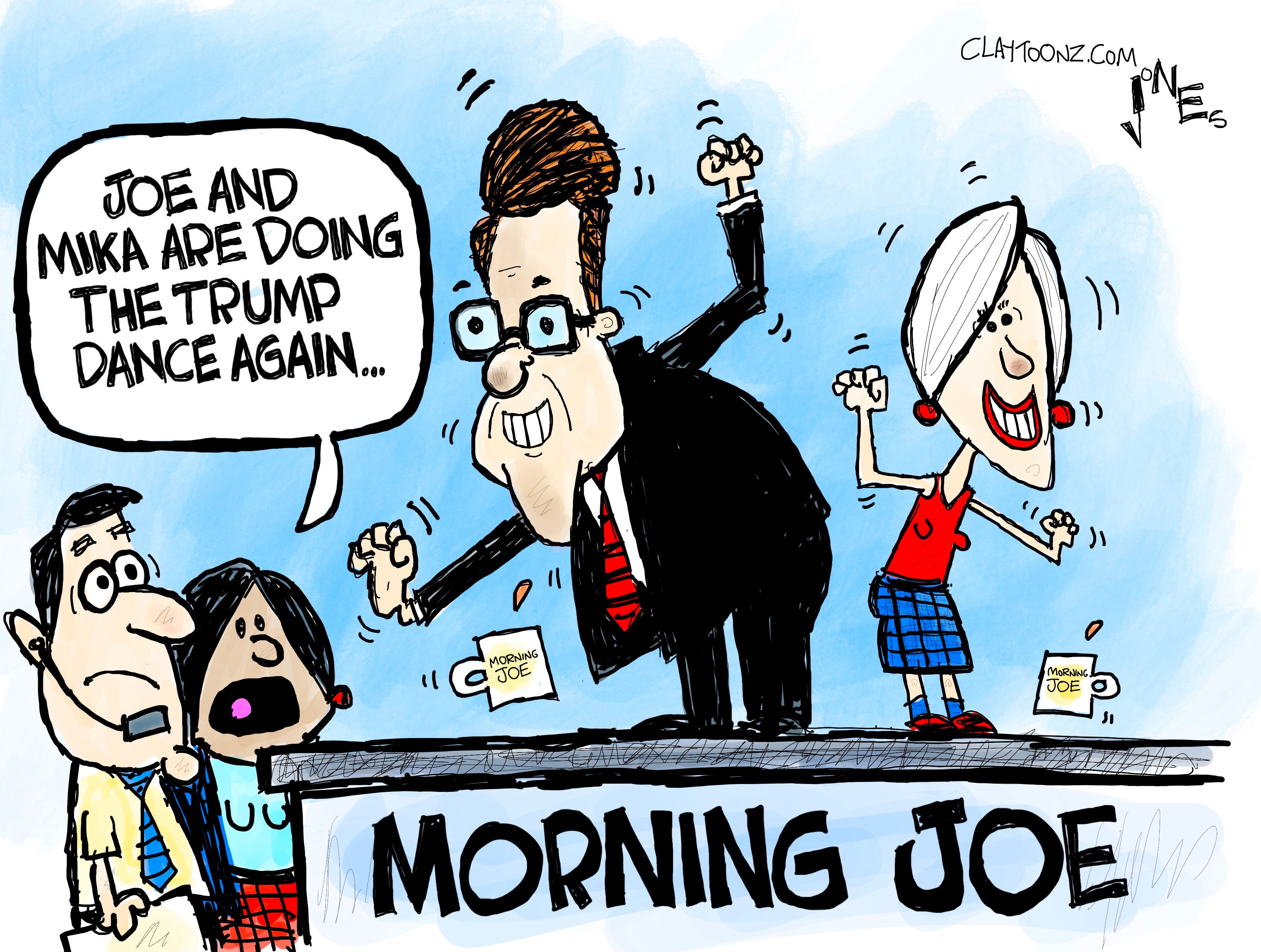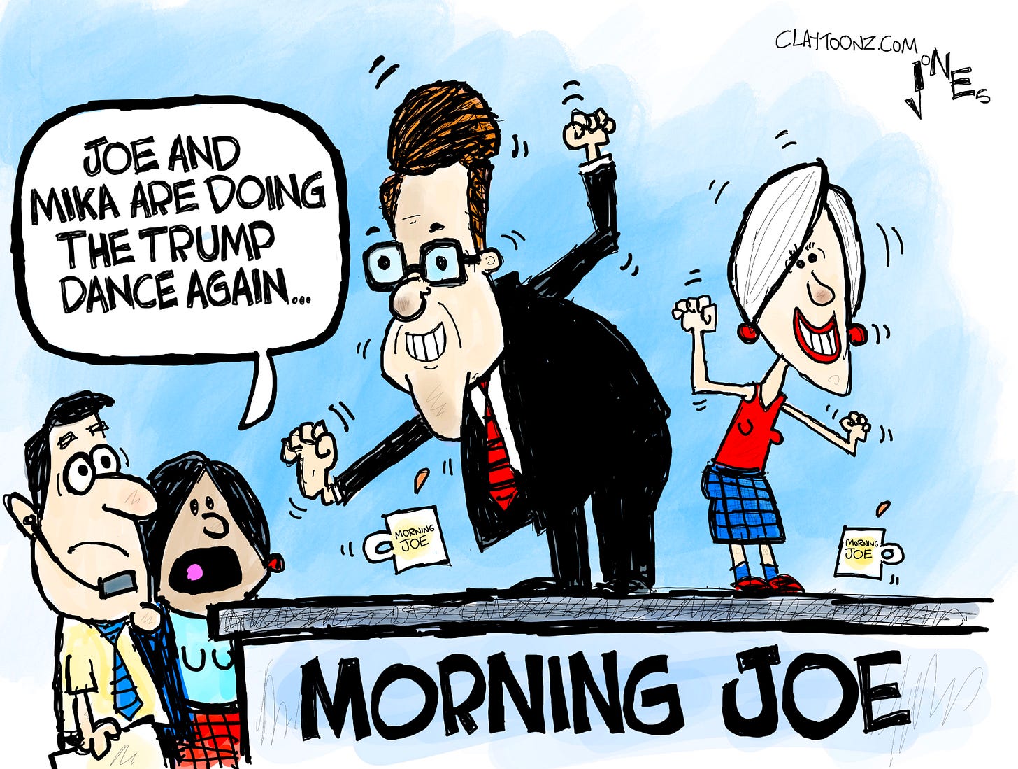 Creative note: As you will recall, I did a cartoon on Joe and Mika yesterday. I don’t like doing the same subject two days in a row, but not a lot of readers understood that cartoon. Also, I wanted to do a cartoon on the Trump Dance. Actually, there are two. You’ll see the other one later.