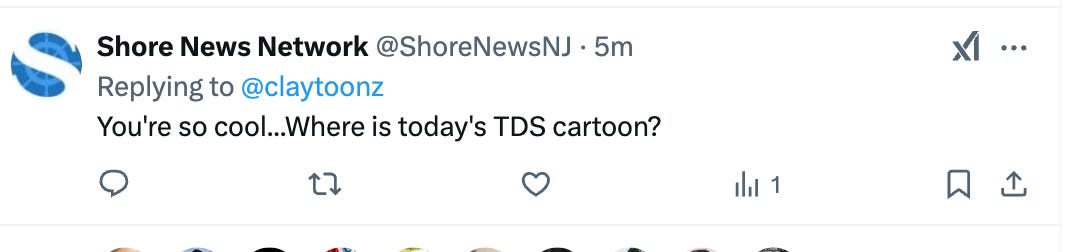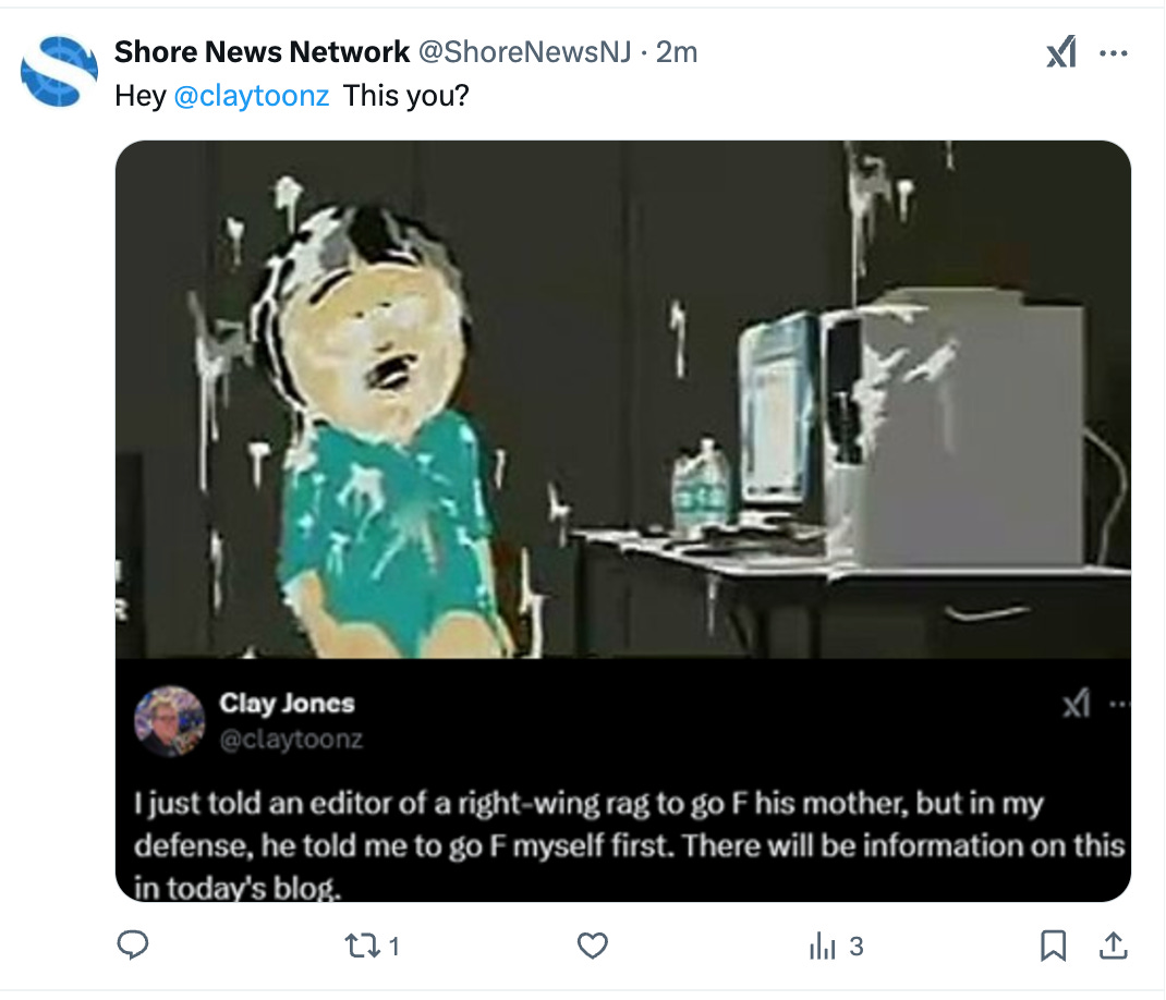 What I wrote isn’t very nice, but they’re MAGAts, so I don’t care. I wrote, “I'm Clay Jones, a political cartoonist. Your reporting on this story is very sloppy. He is NOT a reporter for The Washington Post. Also, why is "anti-Trump" in the headline? He's a political cartoonist who covers many issues. All you did was copy someone else's reporting. It's disgusting that you're trying to politicize this, as though this is a win for MAGA.”