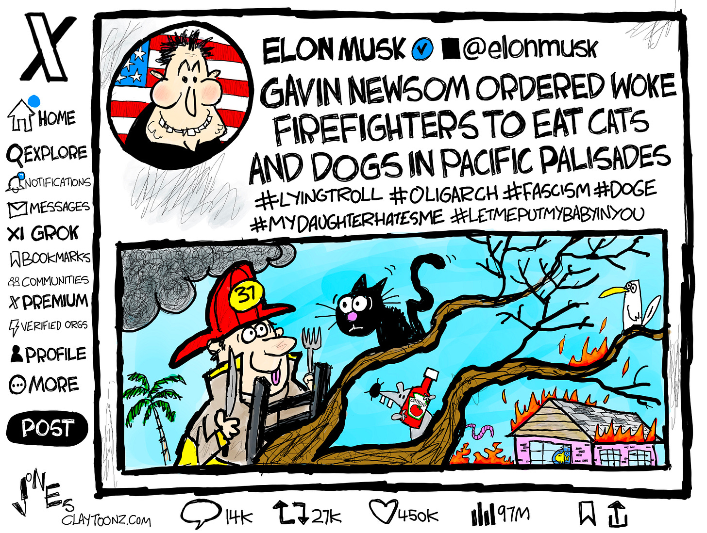 While California has been fighting wildfires in Los Angeles, Elon tweeted that Governor Gavin Newsom legalized looting. Believe it or not, there are millions of people dumb enough to believe this. The fact is, it’s Elon and Trump who will be looting from taxpayers.