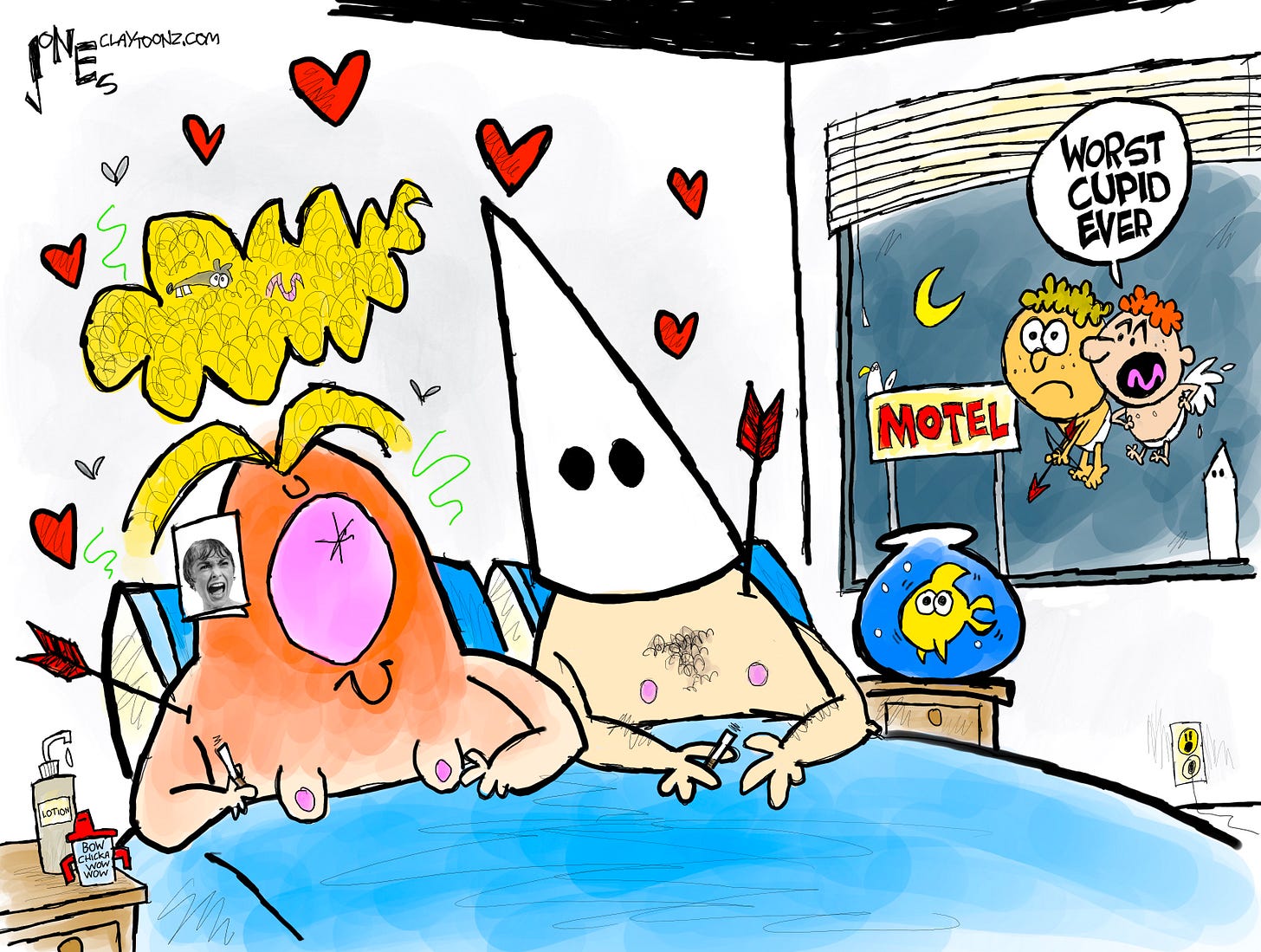Love the creepy references to Psycho (Janet Leigh/Bates Motel?), Valentine’s Day (Cupid, hearts, and arrows), South Park, Trump bedding down with a certified KKK racist, the cigs, the drippy lotion, the funny sippy cup…